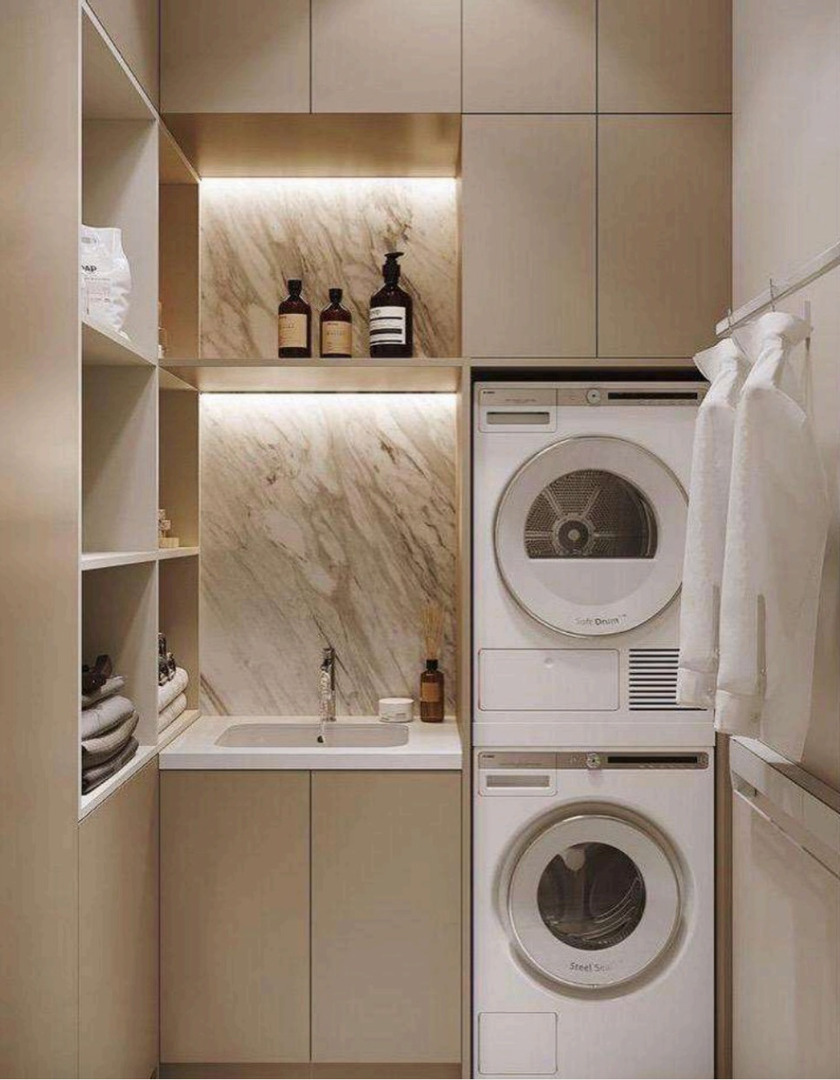 buanderie, une chambre de femme de ménage et des toilettes pour invités.
